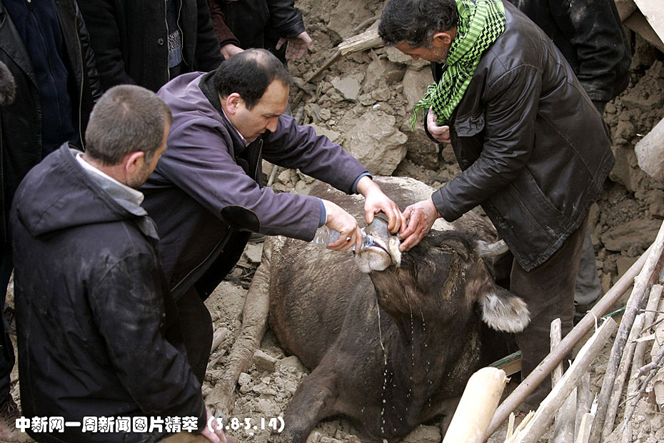周二在土耳其奧克丘拉爾,人們試圖解救一頭被困在廢墟中的牛。土耳其此前一天發生的強烈地震造成至少50人遇難。圖片來源:中國新聞網
