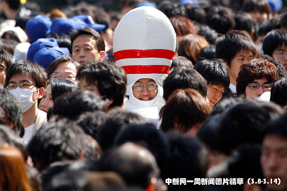 周三,日本東京大學校園里,一名學生裝扮成保齡球瓶的樣子。當天,這所日本最富盛名的大學放榜,眾多考生前往查榜。圖片來源:中國新聞網