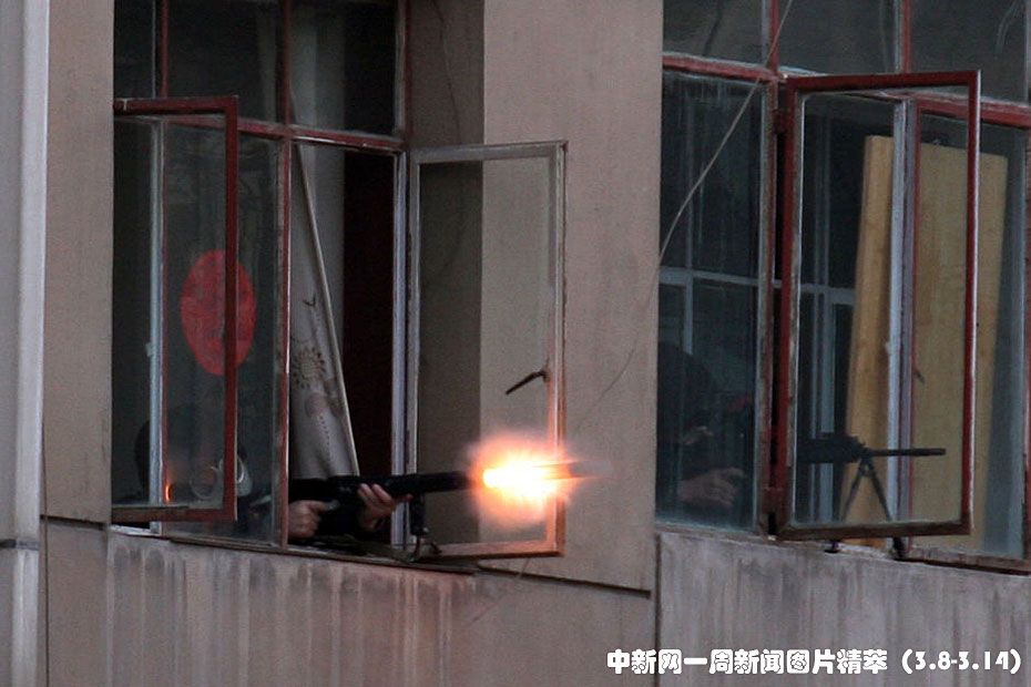周四,甘肅蘭州,警方向槍殺特警嫌犯的藏匿點開火。當天,轟動全國的蘭州槍擊案嫌犯付曉霖被警方發現,嫌犯躲進一居民樓內。雙方對峙長達11個小時,期間人質被解救,最終特警破門進入嫌犯所在屋內將其擊斃。圖片來源:中國新聞網