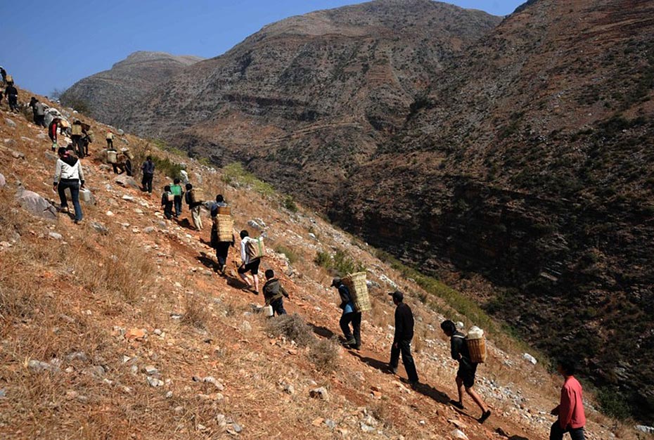 村民背著水走在陡峭的山崖上(3月7日攝)。村民需要背著幾十公斤重的水桶,從海拔1000多米的江邊,小心翼翼地往海拔1800多米的村中跋涉。圖片來源:新華網 秦晴 攝