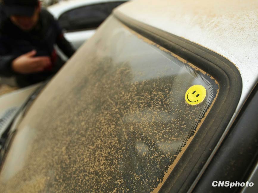 3月20日,春季首場重度浮塵天遮蓋了整個北京城。圖為一輛轎車的后車窗上布滿黃沙。中新社發(fā) 富田 攝