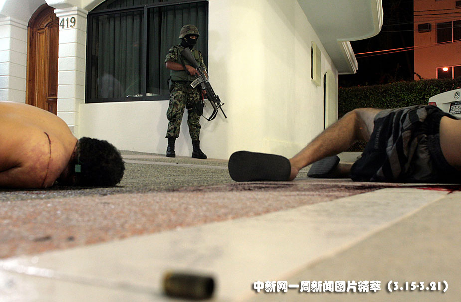 15日(周一),在墨西哥阿卡普爾科一家酒店內(nèi),兩名涉嫌販毒人在一場槍戰(zhàn)中身亡。一名墨西哥士兵正在把守現(xiàn)場。