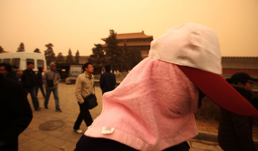 20日,北京遭遇4年來最強(qiáng)浮塵襲擊。游客面帶口罩在沙塵暴中游覽故宮。cuihao 攝