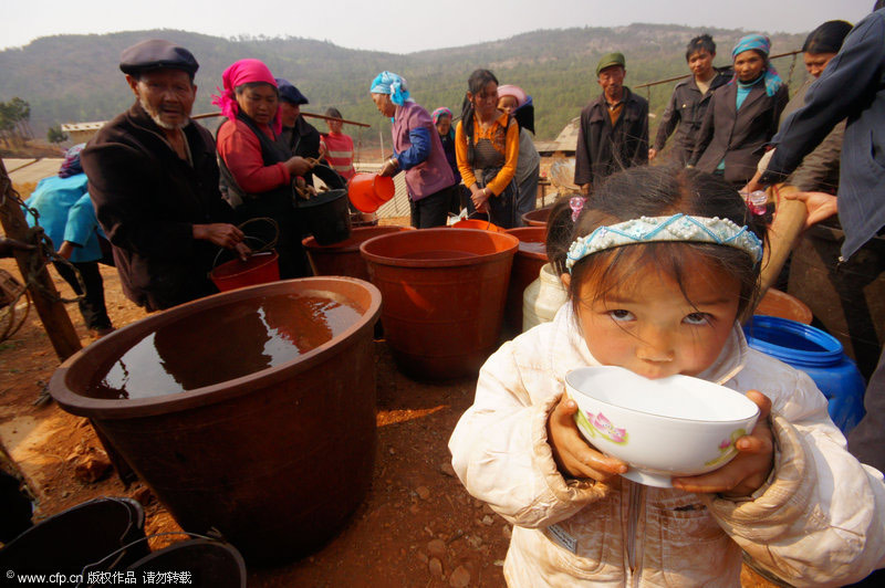2010年3月26日,云南省尋甸縣河口鄉(xiāng),一個(gè)在云南省最早出現(xiàn)旱情的地方,現(xiàn)在很多村的水只能靠政府以及愛心企業(yè)免費(fèi)送水維持生活,很多農(nóng)田絕收,并且正在影響春耕。馬健/CFP