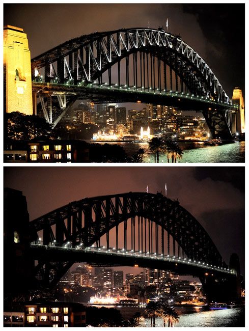 由世界自然基金會發起的“地球一小時”環保活動27日20點30分按照時區依次在全球數千個城市展開。圖為澳大利亞悉尼港大橋在熄燈前和熄燈后的景色。