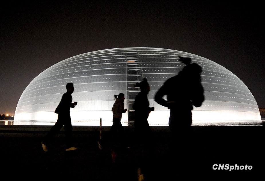 3月27日20點16分,熄燈前許多青年在燈火通明的國家大劇院周圍鍛煉。中新社發 廖攀 攝