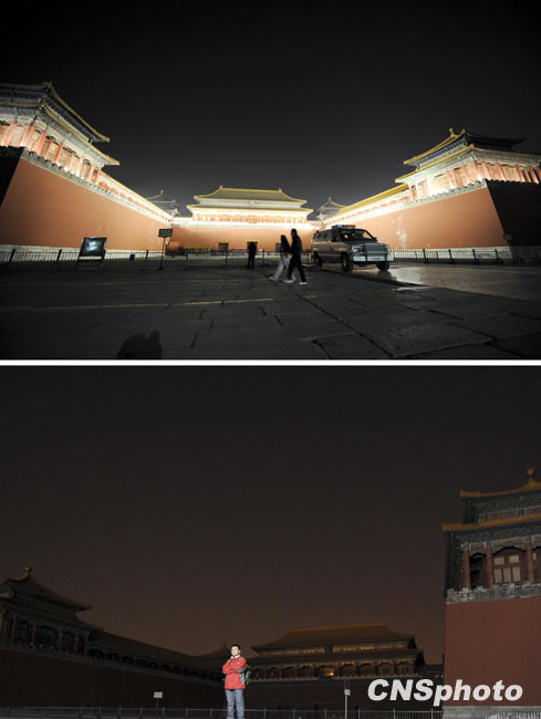 3月27日20時30分,北京故宮博物院與巴黎埃菲爾鐵塔、紐約帝國大廈、悉尼歌劇院等國際地標一起履行“地球一小時”的熄燈承諾關閉了景觀燈。圖為當晚關燈前后的故宮午門廣場。中新社發 廖攀 攝