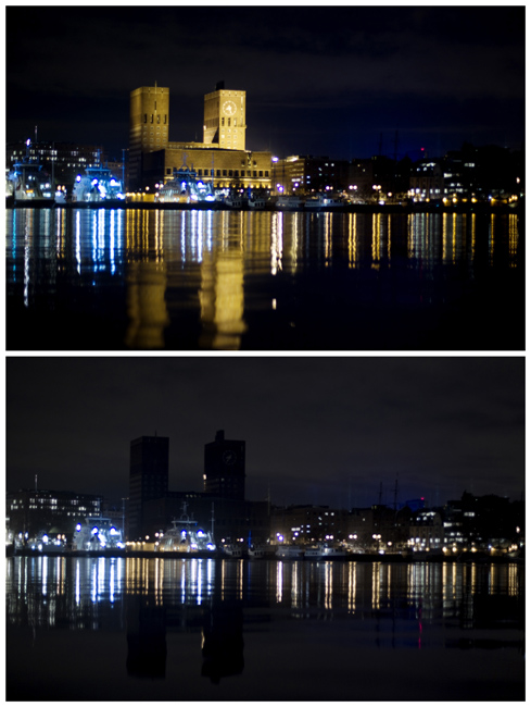 由世界自然基金會發起的“地球一小時”環保活動27日20點30分按照時區依次在全球數千個城市展開。圖為挪威奧斯陸市政廳在熄燈前和熄燈后的景色。