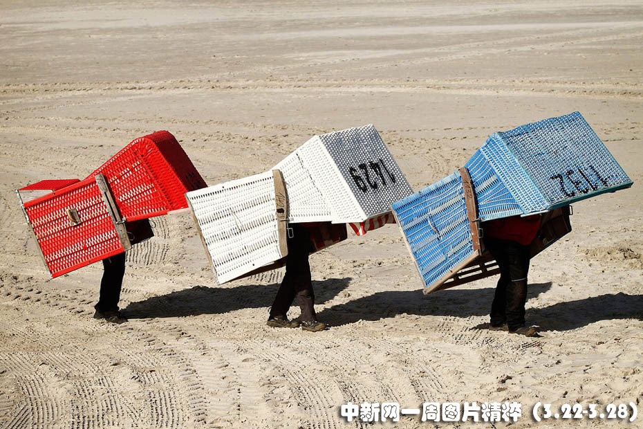 3月23日,德國氣溫持續(xù)升高,工人頂著柳條椅沿海灘前進。