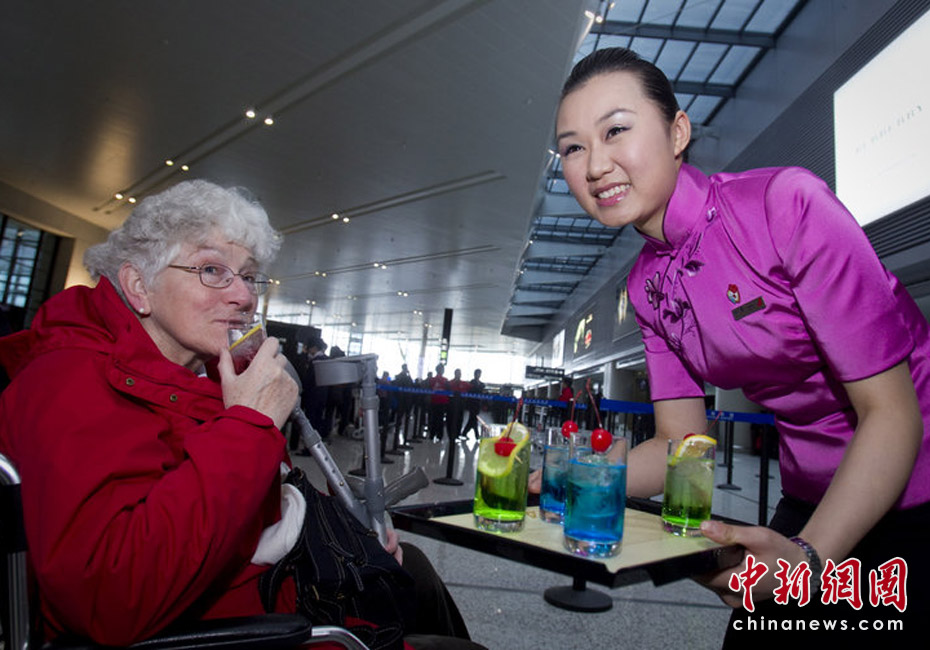 3月25日,上海虹橋機場T2航站樓。上航世博金牌示范乘務員徐翼邀請一名坐在輪椅上的外國旅客品嘗“世博特飲”。劉行喆/CFP
