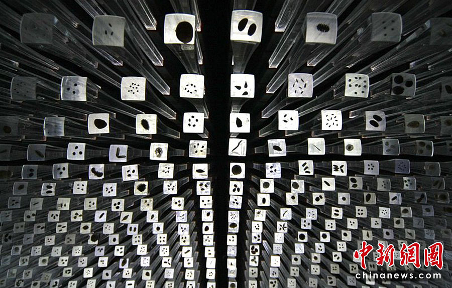 上海世博會籌辦工作已進入最后沖刺階段,在世博建設者的努力下,放眼浦江兩岸的世博園區,星羅棋布的外國國家館、企業館和城市最佳實踐區案例館各具特色,爭奇斗艷。圖為由60686根蘊含植物種子的透明亞克力桿組成的世博會英國館內景。丁曉春/CFP