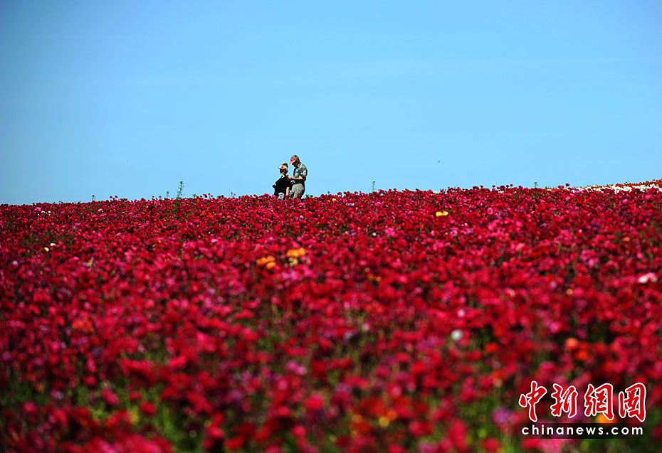 美國加利福尼亞州圣迭戈的卡爾斯巴德花田近日繁花盛開,姹紫嫣紅的花朵整齊地鋪滿在五十英畝的土地上,一望無垠的花海,美不勝收。圖片來源:中國新聞網