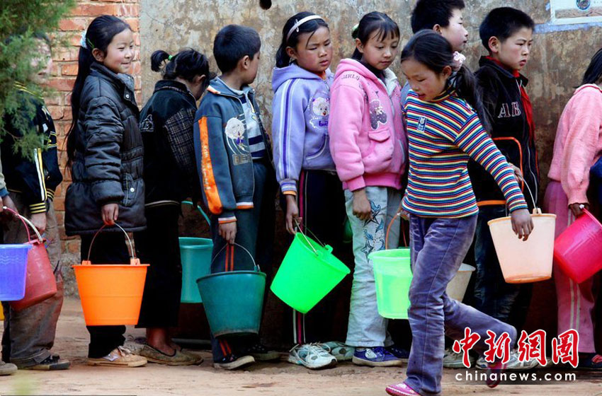 2010年3月31日,云南尋甸縣河口鄉白石巖小學里,一個老師站在水井前控制水量,一個學生5公斤水——這是一天的生活用水。
