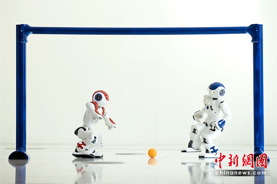 機(jī)器人足球隊(duì)在英國愛丁堡國際科學(xué)節(jié)亮相,它們由愛丁堡大學(xué)研制而成。機(jī)器人足球隊(duì)員內(nèi)置處理器可以感受周圍的環(huán)境和其他機(jī)器人的反應(yīng)。圖片來源:中國新聞網(wǎng)