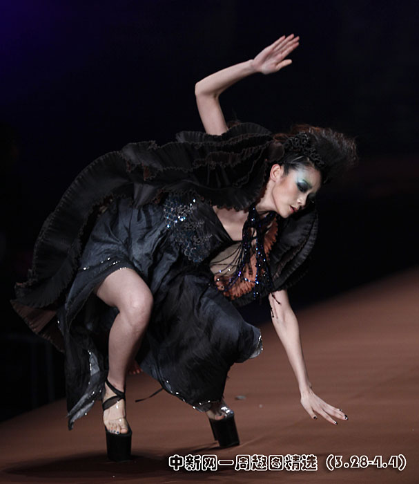 3月29日晚,旭化成·中國時裝設(shè)計師創(chuàng)意大獎張義超作品發(fā)布會在北京舉行,一名模特在T型臺上“失足”摔倒。圖片來源:中國新聞網(wǎng)>>點擊觀看詳細(xì)內(nèi)容