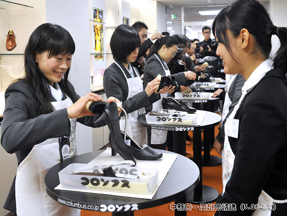 4月1日,日本一家鞋油廠新員工在入職儀式上為老員工擦鞋。圖片來源:中國新聞網>>點擊觀看詳細內容