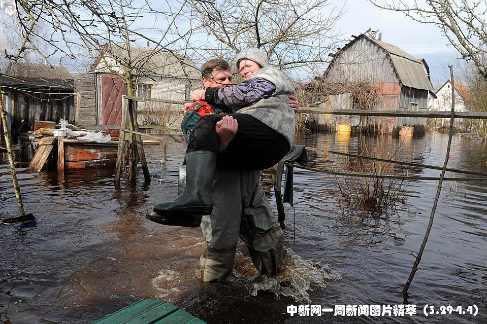 周二(30日),白俄羅斯冰雪融化導致河流泛濫。圖為人們逃離家園。