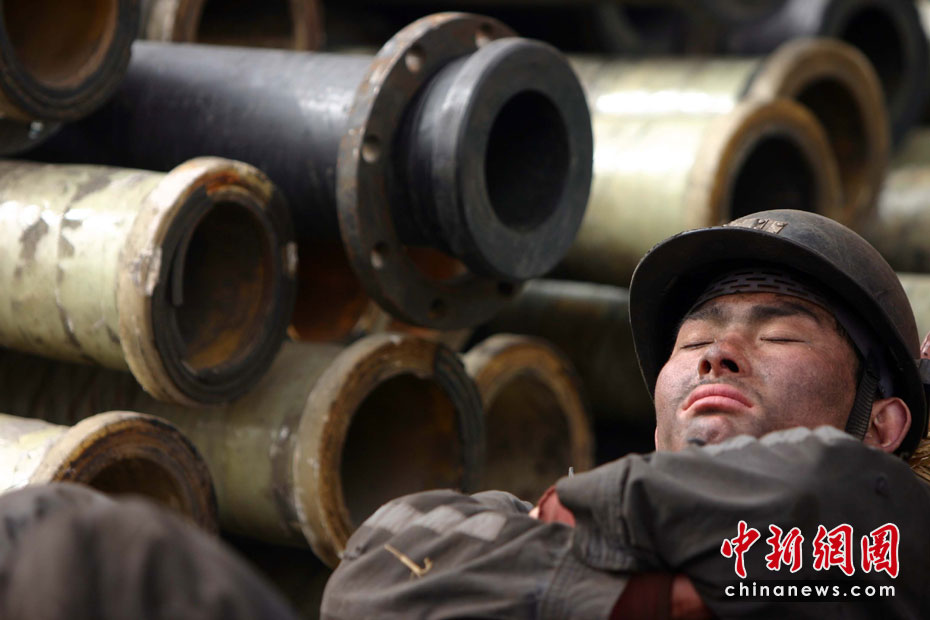 3月30日,“3·28”山西王家?guī)X煤礦透水事故搶險工作仍在進(jìn)行。礦山救護(hù)隊與礦工們?yōu)榧涌炫潘M(jìn)度,夜以繼日地工作,不斷增添新的排水管道以便盡快救出井下被困礦工。圖為疲憊的救援人員正在小憩。中新社發(fā) 張云 攝