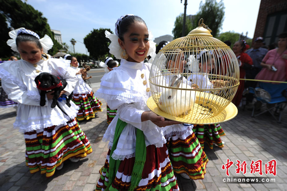 當(dāng)?shù)貢r間4月4日,美國洛杉磯人們在歡慶復(fù)活節(jié)的同時,也為他們的寵物舉行了祝福儀式。這項祝福儀式每年舉行一次。圖片來源:中國新聞網(wǎng)