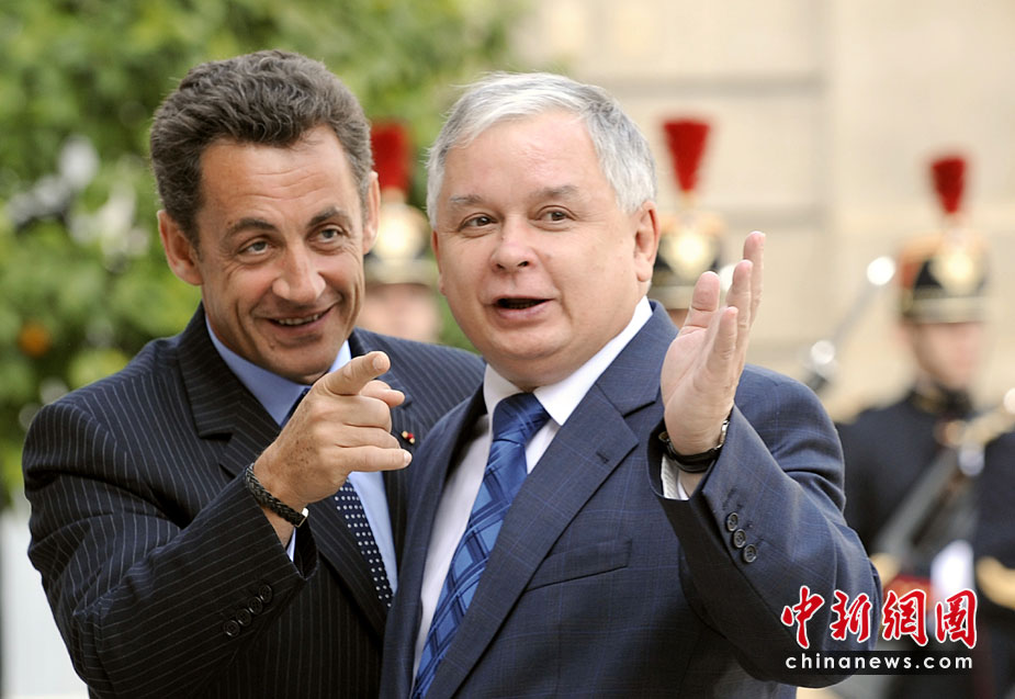 波蘭總統(tǒng)卡欽斯基乘坐的一架圖-154飛機(jī)10日在俄羅斯斯摩棱斯克州北部一軍用機(jī)場降落時失事,至少87人死亡?J斯基本人被確認(rèn)身亡。圖為2007年波蘭總統(tǒng)卡欽斯基與法國總統(tǒng)薩科奇。