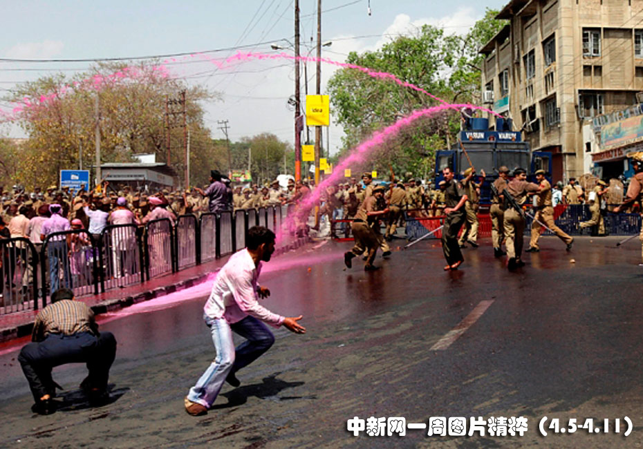 4月5日周一,尋求更多權利的難民在印度查謨街頭舉行抗議,印度警察動用高壓水槍驅散人權,這些水槍噴出的是粉色水柱。