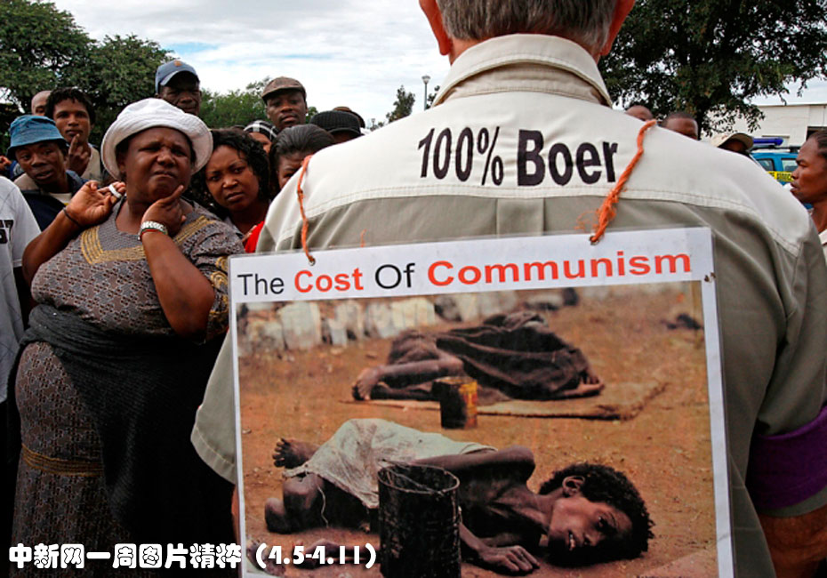 4月6日周二,在南非小鎮(zhèn)文特斯多,被害“白人至上”領(lǐng)導(dǎo)人尤金•特雷布蘭奇的一名支持者(圖右,背對鏡頭者)站在法院門外對人群講話。