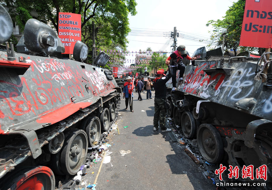 當(dāng)?shù)貢r(shí)間4月12日,泰國紅衫軍在曼谷市區(qū)抬著棺材舉行游行,借此向政府施壓促阿披實(shí)下臺。此前紅衫軍示威者與軍警發(fā)生沖突,造成21人死亡。圖片來源:中國新聞網(wǎng)