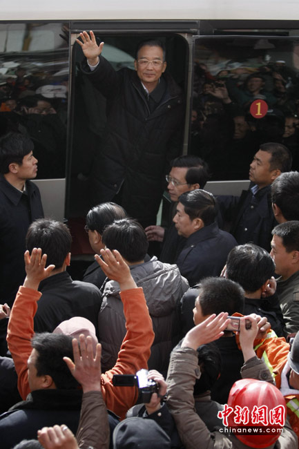 2010年4月16日,中國國務院總理溫家寶在青海省玉樹藏族自治州玉樹縣地震災區視察救援現場。4月14日07時49分許,青海省玉樹藏族自治州玉樹縣(北緯33.1,東經96.7)發生7.1級地震。中新社發 盛佳鵬 攝