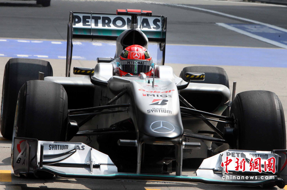 4月16日,2010國際汽聯F1世界錦標賽上海站在上海國際賽車場開始車手第一、第二次練習賽。圖為代表梅賽德斯GP車隊出戰的老車王、德國車手舒馬赫重回上海賽道。 中新社記者 任晨鳴 攝