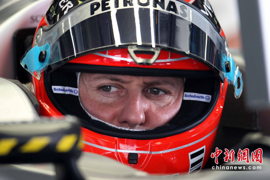 4月16日,2010國(guó)際汽聯(lián)F1世界錦標(biāo)賽上海站在上海國(guó)際賽車場(chǎng)開(kāi)始車手第一、第二次練習(xí)賽。圖為代表梅賽德斯GP車隊(duì)出戰(zhàn)的老車王、德國(guó)車手舒馬赫重回上海賽道。 中新社記者 任晨鳴 攝
