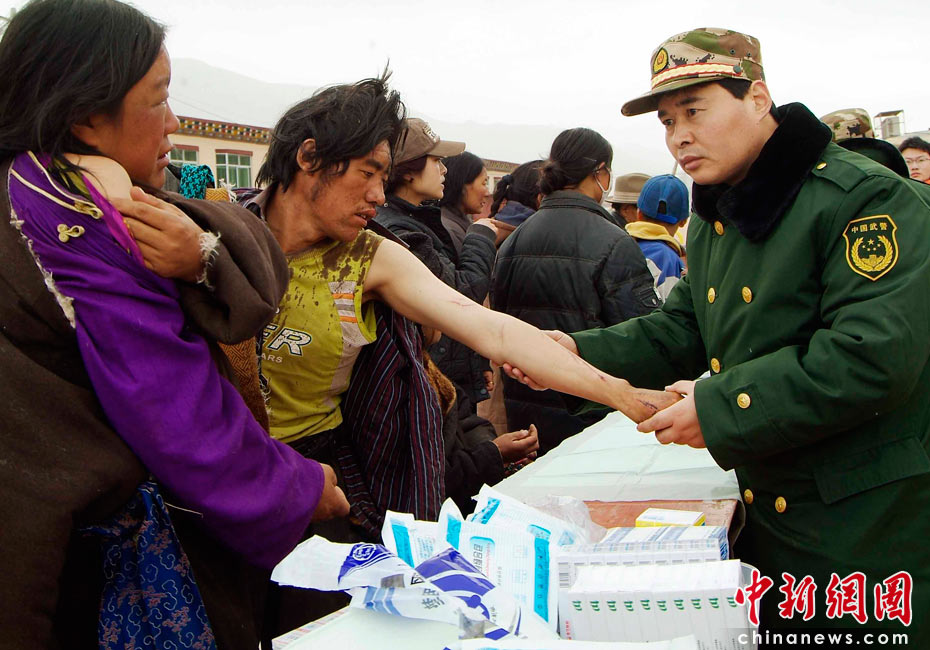 4月16日上午,廣東邊防總隊抗震救災(zāi)醫(yī)療隊在青海玉樹州結(jié)古鎮(zhèn)民族師范學院廣場設(shè)立救治點,當日救助地震災(zāi)區(qū)傷員200多名。中新社發(fā) 陳森陽 攝