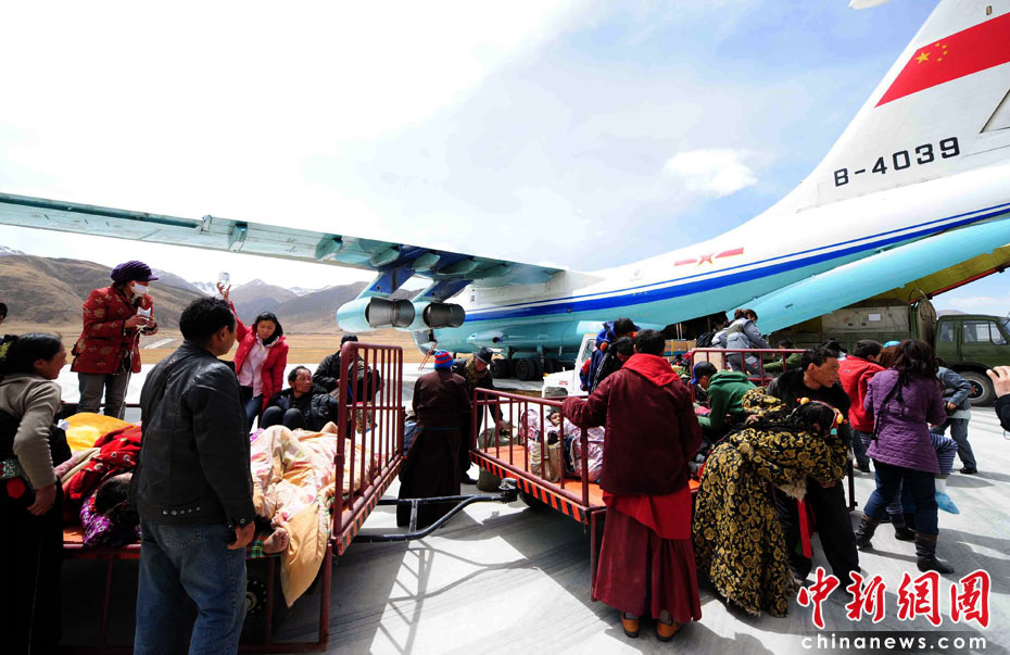 4月16日15時,青海玉樹機場,149名藏族重傷員準備乘坐廣空運輸航空兵某師兩架伊爾-76型運輸機飛往格爾木機場。中新社發 沈玲 攝