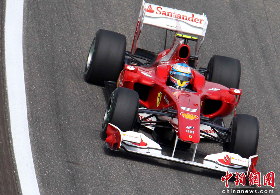 4月17日下午,2010國際汽聯F1世界錦標賽上海站在上海國際賽車場舉行排位賽,代表紅牛車隊出戰的德國車手維特爾獲得桿位,隊友、澳大利亞車手韋伯獲得第二名,法拉利車隊的西班牙車手阿隆索獲得第三名。中新社記者 任晨鳴 攝