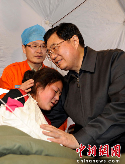 4月18日,中共中央總書記、國家主席、中央軍委主席胡錦濤來到青海玉樹體育場地震災(zāi)民安置點(diǎn)看望受災(zāi)民眾和醫(yī)務(wù)人員。中新社發(fā) 廖攀 攝