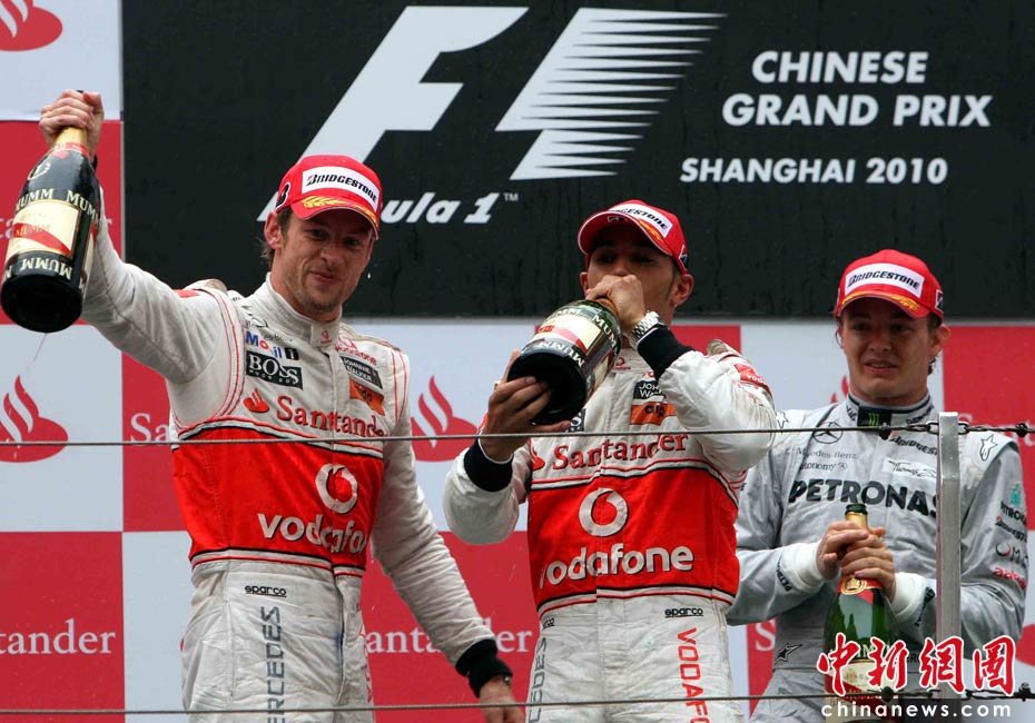 4月18日下午,2010國際汽聯F1世界錦標賽上海站在上海國際賽車場舉行正式比賽,邁凱輪車隊的英國車手巴頓(左)在雨中獲得冠軍、隊友、英國車手漢密爾頓(中)獲得亞軍,梅賽德斯GP車隊的德國車手羅斯伯格獲得季軍。中新社記者 任晨鳴 攝