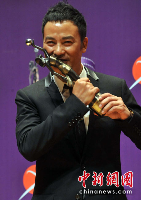4月18日晚,“第二十九屆香港電影金像獎”頒獎典禮在香港文化中心大劇院隆重舉行,影星任達華憑演出電影「歲月神偷」奪得最佳男主角獎項。圖為任達華親吻最佳男主角獎項。中新社發 鄧慶樂 攝
