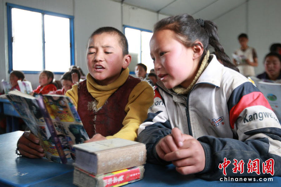 4月18日,70多名孩子在地震四天后重新走進了課堂,玉樹州孤兒學校成為了地震災區第一所復課的學校,剛完成帳篷搭建的青海省玉樹藏族自治州第一民族中學3個年級的學生也開始復課。青友 攝