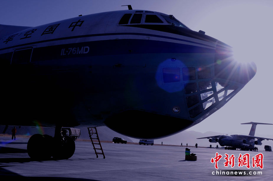 中國空軍伊爾76大型運輸機隊4月中旬遠征青海玉樹地震災區,建立玉樹飛往西南、西北多座大都市的空中生命救援大通道。中新社發 賈國榮 攝