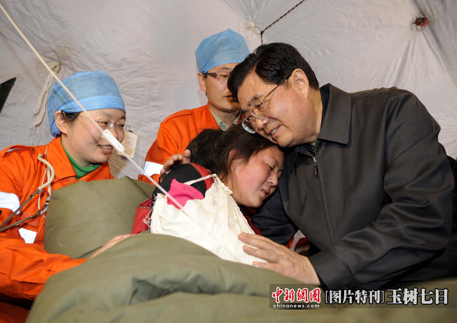 4月18日,中共中央總書記、國家主席、中央軍委主席胡錦濤來到青海玉樹體育場地震災民安置點武警總醫(yī)院醫(yī)療隊看望受災民眾和醫(yī)務人員。中新社發(fā) 廖攀 攝