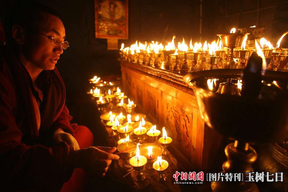2010年4月18日,青海玉樹結古鎮格薩爾王廣場,雪域阿日香巴拉凈土五明佛學院搭建了帳篷,免費為民眾提供酥油燈,為地震遇難者祈禱。中新社發 蘇丹 攝