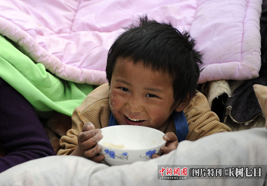 災難的來臨無法選擇,但是面對災難的方式,卻始終掌握在每個人自己手中。家園被毀,失去親人,傷痛過后生活還要繼續,愿玉樹的受災群眾選擇堅強,用堅韌和信心去開創新的生活。 圖為青海玉樹體育場地震民眾安置點,一名孩童歡快地吃東西。中新社發 廖攀 攝