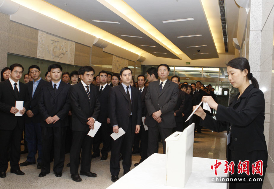 當地時間4月21日,中國駐紐約總領館舉行儀式,沉痛悼念青海玉樹地震遇難同胞。圖為悼念儀式后,中國駐紐約總領事館全體工作人員為青海玉樹捐款。中新社發 魏晞 攝