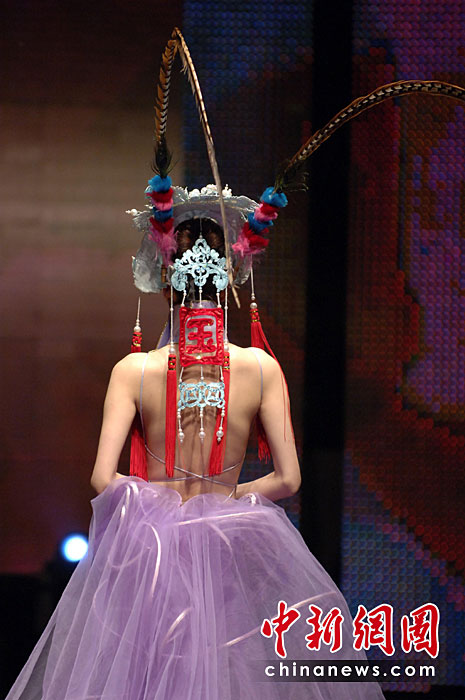 4月20日晚,首屆海西國際時裝周在福建石獅閉幕,本屆時裝周吸引了來自海峽兩岸的紡織服裝界企業(yè)家和知名服裝設(shè)計師。期間舉辦了12場時裝品牌和設(shè)計師作品動態(tài)發(fā)布會。圖為模特展示古今潮流結(jié)合的服裝。王東明 攝