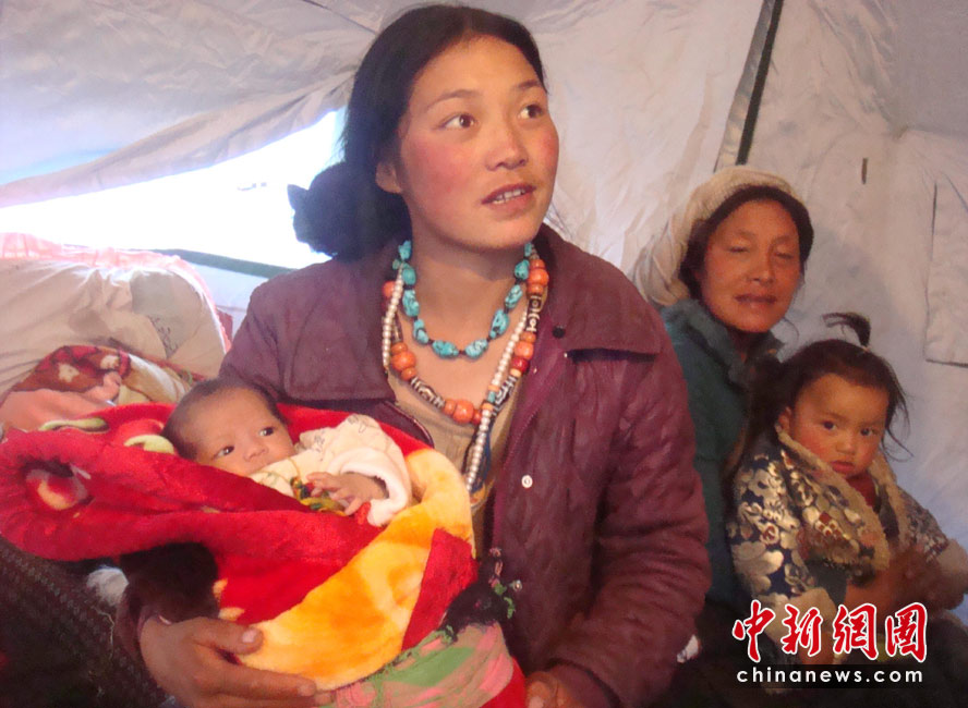 襁褓中這位還沒有取名的藏族嬰兒,堪稱玉樹地震災區最令人愛憐的藏族小嬰兒——出生第十五天就遭遇到青海玉樹強烈地震,媽媽和多位家人不幸罹難。如今小嬰兒由幸存的姑媽呵護著,棲身在第二炮兵總醫院醫療隊的救災帳篷里。中新社發 賈國榮 攝