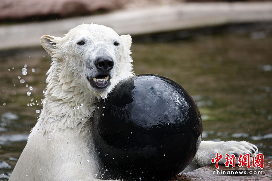 4月23日,德國紐倫堡動物園內(nèi),兩頭北極熊在公園內(nèi)的水池中盡情玩耍,享受春天的陽光。圖片來源:中國新聞網(wǎng)