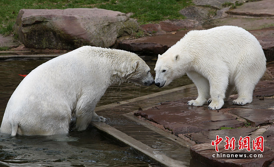 4月23日,德國紐倫堡動物園內,兩頭北極熊在公園內的水池中盡情玩耍,享受春天的陽光。圖片來源:中國新聞網