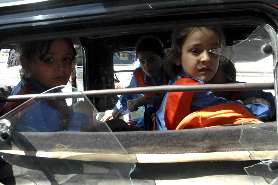 周一(19日),巴基斯坦白沙瓦發生炸彈爆炸事件。圖為學生坐在炸彈攻擊后的車內。
