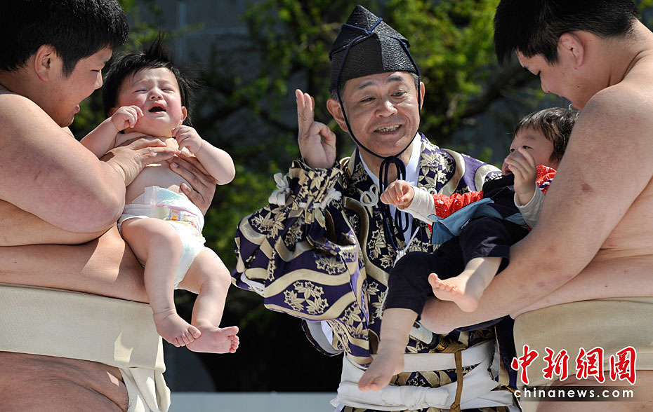4月25日,日本東京,幾名相撲手手抱嬰兒,正努力使嬰兒哭泣。當日,一年一度的日本一周歲以下嬰兒啼哭大賽在東京淺草寺舉行。第一個讓嬰兒哭泣的選手將贏得比賽,日本通過此種比賽為孩子的健康祈福,他們認為嬰兒哭泣將對他們將來的身體健康有利。圖片來源:中國新聞網