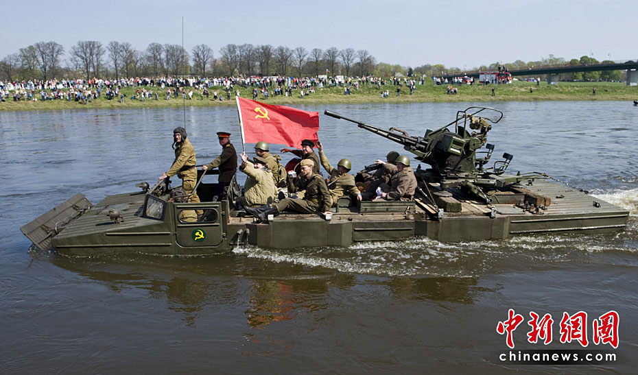 德國(guó)當(dāng)?shù)貢r(shí)間4月24日,演員身著二戰(zhàn)時(shí)期美蘇軍裝在德國(guó)托爾高南部易北河畔的一座小橋上重現(xiàn)當(dāng)年的“會(huì)師”一幕。