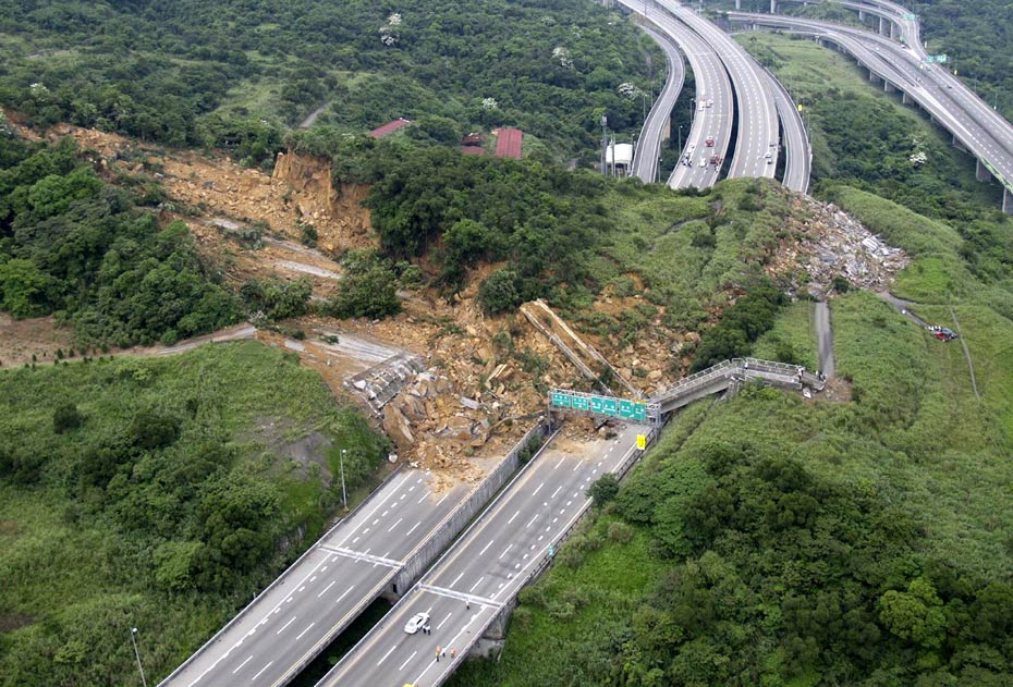 4月25日, 臺灣一條交通要道、“北二高”基隆段發生山崩意外,傾瀉而下的土石壓垮一座高架橋,并覆蓋道路約200米,據傳有人車被埋。(圖片來源:“中央社”)。